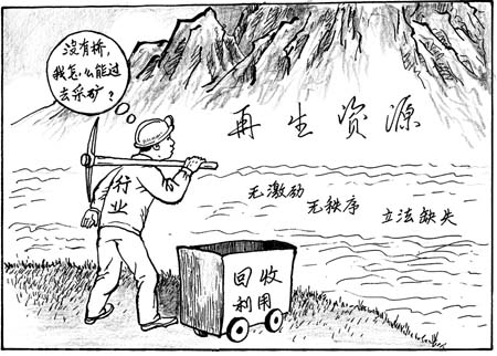 再生資源的利用是一座巨大的金礦,許多國家再生資源的產(chǎn)值已經(jīng)超過了其支柱產(chǎn)業(yè),而我國每年可以回收利用但又沒有被回收利用的再生資源價值達350—400億美元。面對這樣的一個金礦,有人問:“為什么不去挖呢?”。發(fā)展再生產(chǎn)業(yè)既能創(chuàng)造價值又能減輕環(huán)境污染、節(jié)約能源,何樂而不為呢?問題在于,再生資源產(chǎn)業(yè)發(fā)展的法規(guī)不健全,現(xiàn)有的激勵政策缺乏系統(tǒng)性和可操作性,導致產(chǎn)業(yè)無序化發(fā)展。比如,沒有正確的垃圾分類,再生資源無法回收,再生資源產(chǎn)業(yè)也就成了“無米之炊”。因此,要使這個金礦被挖掘,就需要國家加強這方面的立法,下大力氣在資金、技術(shù)、管理等方面扶持再生資源產(chǎn)業(yè)。改變再生產(chǎn)業(yè)經(jīng)營規(guī)模小、技術(shù)落后等現(xiàn)狀。像這樣利于后代、利于可持續(xù)發(fā)展的事業(yè),不做好,太可惜! |