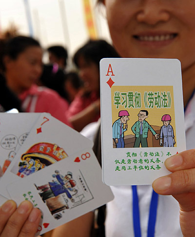 7月28日,一名職工展示普法撲克牌。當(dāng)日,寧夏召開(kāi)“法律進(jìn)寧東能源化工基地”現(xiàn)場(chǎng)會(huì),在會(huì)上向企業(yè)員工發(fā)放《法律知識(shí)讀本》、維權(quán)聯(lián)系卡和普法撲克牌,宣傳依法維權(quán)知識(shí)。