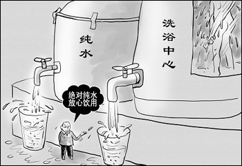 據(jù)《揚(yáng)州日報》報道,當(dāng)?shù)匾患蚁丛≈行幕ㄖ亟疬M(jìn)口國外凈水設(shè)備,打出“可以喝的洗澡水”的廣告,經(jīng)理更是當(dāng)著記者喝下了一杯凈化過的洗澡水,并稱他們的員工平時飲用的就是洗澡水。洗澡水縱然能喝,仍然是用來洗澡的。此種矯枉過正的經(jīng)商之道,實(shí)在叫人不敢恭維。