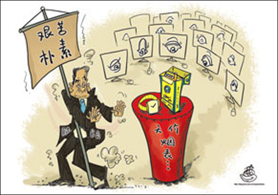 新聞:被網(wǎng)友稱為“天價煙局長”的周久耕前不久被南京市中級法院以受賄罪一審判處有期徒刑11年。周久耕的倒下在南京官場引發(fā)網(wǎng)絡(luò)焦慮癥,不少官員不約而同地“艱苦樸素”起來:穿舊衣、抽當?shù)禺a(chǎn)的普通煙、喝當?shù)禺a(chǎn)的普通酒、戴電子表或國產(chǎn)表,避名牌唯恐不及。(11月10日《檢察日報