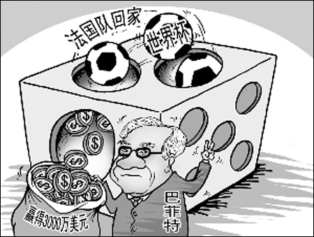 1998年世界杯冠軍法國(guó)隊(duì)被東道主南非隊(duì)掃地出局,卻讓巴菲特贏(yíng)了一場(chǎng)不小的賭注。因?yàn),根?jù)一份售出的保單,如果法國(guó)隊(duì)本屆奪冠,伯克希爾·哈撒韋公司將向某保險(xiǎn)客戶(hù)支付3000萬(wàn)美元。這位客戶(hù),有媒體猜測(cè)可能是家樂(lè)福。