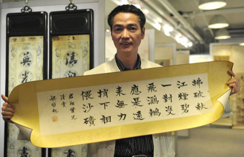 香港普藝拍賣公司將于4月10日拍賣劉墉、馮玉祥、梁啟超等歷史名人的書畫作品,吸引了眾多買家前來咨詢。圖為拍賣公司工作人員正向媒體介紹梁啟超的一幅隸書。