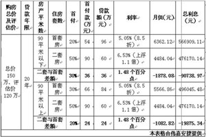 以總價為150萬、評估價為120萬的房產(chǎn)為例:90平米以下二套房與首套房相比,借款人要多支付首付36萬元,每月月供可節(jié)省1878.08元,總利息可節(jié)省90838.97元;90平米以上二套房和首套房相比,借款人要多支付首付24萬元,每月月供可節(jié)省1082.82元,總利息可節(jié)省19875.34元。(見下圖)