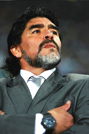 2008年11月4日,時(shí)年48歲的馬拉多納成為了阿根廷隊(duì)的主教練。在世界杯開幕之前,他聽從女兒的建議穿上了西裝,阿根廷《獨(dú)立報(bào)》這樣評(píng)價(jià)道,“這標(biāo)志著馬拉多納清楚地認(rèn)識(shí)到,自己不能在球場(chǎng)上親自施展奇跡了!泵摰羟蛞麓┥衔餮b,并且在左右手腕均戴上了Hublot腕表。馬拉多納從踢球的上帝變?yōu)榱艘幻麤Q策者,阿根廷隊(duì)的帶頭大哥。 在現(xiàn)在的這只阿根廷隊(duì)中,幾乎所有隊(duì)員都是看著馬拉多納踢球長(zhǎng)大的。因此,馬拉多納能夠?qū)⒆约禾咔驎r(shí)的反叛氣質(zhì)毫無(wú)保留地注入到這支隊(duì)伍中。很多人都認(rèn)為馬拉多納的這支阿根廷隊(duì)并不是完美無(wú)缺的,但是這并不妨礙隊(duì)員們一次次撕開對(duì)手的防線,以最匪夷所思的方式將足球送進(jìn)對(duì)手的大門。整個(gè)過(guò)程輕松到他們的前鋒伊瓜因只需要在門前1米處將皮球輕巧地改變一個(gè)方向,便可以完成致命的最后一擊。 這是馬拉多納式的勝利,缺乏理性的邏輯,但卻痛快淋漓。實(shí)際上,在馬拉多納之后,人們總是喋喋不休地討論著誰(shuí)將成為他的接班人。而在本屆世界杯上,梅西終于讓所有質(zhì)疑的聲音消失。梅西在比賽中只有一種戰(zhàn)術(shù),這就是馬拉多納戰(zhàn)術(shù)。馬拉多納完全將梅西當(dāng)做1986年的自己,而尋找馬拉多納的接班人,這簡(jiǎn)直成了阿根廷隊(duì)必須完成的一種宗教儀式。