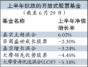 今年上半年,在滬深股市跌幅約達(dá)26.8%的市況下,偏股基金也是一片慘綠。 其中,被動跟蹤指數(shù)投資的指數(shù)型基金損失最為慘重。根據(jù)銀河證券研究所數(shù)據(jù),截至今年6月29日,標(biāo)準(zhǔn)指數(shù)型基金上半年凈值平均下跌了25.58%,增強(qiáng)指數(shù)型基金期間凈值平均跌幅25.54%。 而各類主動型偏股基金均大幅跑贏大盤,平均凈值跌幅約在14%~18%之間。不過,僅有嘉實(shí)主題精選取得正收益。截至6月29日,該基金凈值逆勢增長6.02%,排名僅居其后的華商盛世成長、嘉實(shí)增長混合今年以來凈值也均有所虧損。