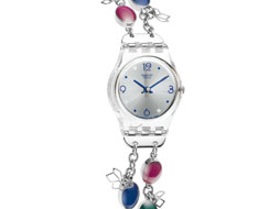 斯沃琪月光寶石·浪漫名媛淑女腕表(LadyMaona)的表鏈繼承了斯沃琪Bjioux的色彩和繁花圖案,采用拋光不銹鋼316L制造,由略呈拱形的橢圓團花構(gòu)成,飾以彩色半透明合成樹脂。橢圓團花與優(yōu)美的花卉吊飾從鏈條上垂掛而下,通往透明的塑料表殼。優(yōu)雅的設計凸顯了腕表的精致與名媛氣質(zhì)。