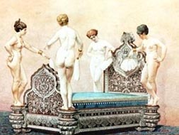 價值8萬法郎、鑲金飾銀并在床的四角裝置四座真人大小的銅質(zhì)彩繪裸女像的雕花大床,中央的機(jī)械系統(tǒng)連接音樂盒,當(dāng)侍女們扇扇時,音樂盒就會開始演奏長達(dá)30分鐘的美妙樂曲。