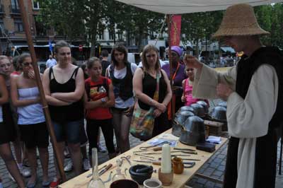 6月30日,一些學生在比利時首都布魯塞爾街頭觀看古代郎中和他的器具。當天,布魯塞爾情景再現(xiàn)歐洲中世紀的世俗生活,以獨特方式慶祝比利時即將擔任歐盟輪值主席,并迎接暑假的到來。