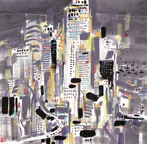 吳冠中借喻了魯迅筆下的“小樓”,表述的是自己躲進藝術殿堂,走南闖北,東尋西找,上下求索的境懷;以及越過傳統(tǒng)筆墨、傳統(tǒng)圖式,不為外界左右的藝術激情!包c、線、面,黑、白、灰,加自家色彩”是吳冠中藝術形式的七要素。在這幅畫中,作者將這些要素充分展示給了觀眾。另一幅作品《香港夜景》是吳冠中受香港土地發(fā)展公司邀請,專程在香港停留一個月而創(chuàng)作出的嘗試性作品之一。畫面無處不涌動著作者的創(chuàng)作激情,其大膽的跳過線的點與面的結合,加上豐富色彩的綜合運用,將香港之夜表現(xiàn)得熱鬧而又神秘。吳冠中曾多次撰文提到這次香港創(chuàng)作之旅:“我確乎愛那些古老市街的風采,那是我青少年時代所熟悉的祖國鬧市,我曾在其間逛游,當時只是觀光,無錢購物,今日坐在香港街頭寫生,筆底卻流露出童年的憧憬來。”