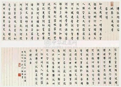 1931年6月,紀(jì)念亡父誕辰120周年,弘一法師以姚秦三藏鳩摩羅什翻譯的《佛說阿彌陀經(jīng)》全文為內(nèi)容完成了一生中最大尺幅的書法作品《佛說阿彌陀經(jīng)》。日前,這一遺墨在上海朱屺瞻藝術(shù)館舉辦的“海上因緣——李叔同(弘一法師)、陸維釗、吳一峰書畫精品展”上亮相。 《佛說阿彌陀經(jīng)》為楷書,全文加上63字款跋總計1836字。據(jù)介紹,《佛說阿彌陀經(jīng)》是弘一法師分16天寫成的,當(dāng)時就引起了轟動。弘一法師把它送給了劉質(zhì)平,報答他對自己生活的照料。劉質(zhì)平是弘一法師的學(xué)生、現(xiàn)代著名音樂教育家。那年,弘一法師住浙江鎮(zhèn)海伏龍寺,劉質(zhì)平前后侍奉一個多月。對于這件遺墨,劉質(zhì)平視同生命,雖歷經(jīng)動亂與貧困,一直悉心保存。1978年劉質(zhì)平逝世后,墨寶由其子劉雪陽收藏。2000年,劉雪陽將《佛說阿彌陀經(jīng)》獻(xiàn)給國家。