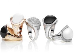 兩款最新設(shè)計(jì)的戒指采用白金材質(zhì)綴以黑色縞瑪瑙或者白瑪瑙,用鉆石搭配,在設(shè)計(jì)和外觀上令人眼前一亮?傊亓窟_(dá)0.8克拉的裝飾鉆石由不同大小的圓形明亮鉆石構(gòu)成,凸顯黑色或白色寶石與黃金的柔性美之間的強(qiáng)烈對比。 兩款戒指中寶石的選擇為純白色或者醒目黑色,這不僅映襯出萬寶龍的品牌身份,更是頂級珠寶世界中經(jīng)典有力的顏色,令人聯(lián)想到大膽性感或者純粹寧靜。五款戒指中的每一款都彰顯了女士珠寶佩戴的獨(dú)特品質(zhì)——優(yōu)雅,成熟,自信。