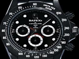 黑色對(duì)于很多人來說充滿了深藏不露的神秘感,特別是全黑魂版的手表,一向是潮人的入貨指標(biāo),就連藤原浩都找英國的Bamford Watch Department用PVD技術(shù)去特制了些fragmentdesign閃電版“黑撈”。而BAPE亦乘勢(shì)推出了最新的全黑魂版的Bapex,3針表上除了數(shù)字、刻紋外,無論表身、表帶、表盤全用上黑色作主要色調(diào),cool!