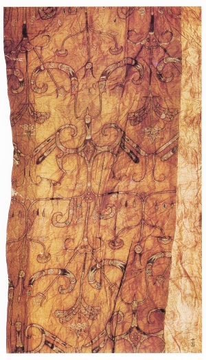 | 戰(zhàn)國淺黃刺繡飛鳳花卉紋殘片 |