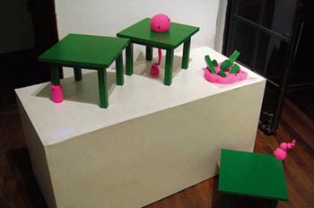 space”,途中一共問了6個(gè)交通協(xié)管員。這是一幢帶花園的小洋樓,仔細(xì)尋找一番后,終于在門口看到了關(guān)于這個(gè)展覽的小小招貼—巴掌大的招貼用纖細(xì)的文字告訴你:就在這里。這讓我想起星爺版《鹿鼎記》中韋小寶在菜市場(chǎng)尋找天地會(huì)分舵的一幕。展廳大概10平方米,里面擠滿了“藝術(shù)發(fā)燒友”。當(dāng)時(shí)我就在想,做這樣的展覽真好,只要來五六個(gè)人,就感覺濟(jì)濟(jì)一堂了。 楊腸筱道,這個(gè)名字來自這次展覽的兩位女藝術(shù)家,胡筱瀟和陸楊?吹剿齻儠r(shí),胡筱瀟正在給每位來賓分發(fā)她的藝術(shù)材料,一種顏色奇艷、介于雕塑泥和軟糖之間的泡沫,她就是用這種古怪材料加上幾只仿真蒼蠅、幼兒園的木質(zhì)小板凳,糾纏在一起做出的作品。當(dāng)看到每一位來賓一邊談話,一邊手里都不知不覺把她的泡沫泥捏成稀奇古怪的形狀時(shí),我知道,胡筱瀟又在得意了。我們都已經(jīng)不自覺地成了她作品的一部分。然后她還用非常劣質(zhì)的木框把自己寫的類似童話、詩歌或者小說的文字框起來,一絲不茍地譯成英文。真有不少人在認(rèn)真地試圖讀懂其中的意思。這就是小空間的好處,空間太小人太多,當(dāng)你不認(rèn)識(shí)什么人也無話可說的時(shí)候,最好就是假裝去思考作品的深刻含義。 陸楊的作品和她的長(zhǎng)相一樣,貌似清秀,但這是假象。她喜歡很和藹可親地給你講述一件無比殘酷的事情。她的作品用很清秀的手繪圖片和很干凈細(xì)膩的文字,告訴你很多種新奇的自殺方式。對(duì)殘酷的迷戀,或許是80后新人的某種集體愛好吧。