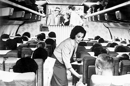還有一點與現(xiàn)在不同的是:那時候航空公司能提供的服務(wù)很受局限。那時候乘飛機穿越美國通常都要?亢脦状,而且中間很可能必須換乘別家航空公司的飛機?ㄋ圭暾f,“你沒法從起點直接到達目的地! 這一現(xiàn)狀在上世紀60時代末70年代初有所改觀,這一時期被譽為航空業(yè)的又一個黃金時代,噴氣式飛機大量涌現(xiàn),取代了活塞引擎式飛機。兩相比較,前者更可靠也更安全。 噴氣式飛機可以搭載更多的乘客,速度也快了很多,因此航空公司就有了大量的座位可以出售。他們在機艙內(nèi)安排了非常寬裕的伸腿空間──比如今經(jīng)濟艙每排之間的空間多了3至6英寸。此外還有很多空位置可以讓旅客自由舒展身體。飛機的載荷系數(shù)或者說乘坐率,在1968年是45.9%,2009年則是80.4%。 為了吸引新乘客、籠絡(luò)常旅客,航空公司各出高招相互競爭:可口的飯菜啦,穿著熱褲和迷你裙的空姐提供無微不至的機上服務(wù)啦,極富挑逗意味的“跟我一起飛”的廣告啦,等等。 波音747飛機于1969年投入航線運營,為普羅大眾開啟了國際飛行之門,在當年,其頭等艙里設(shè)有鋼琴酒吧,即便是經(jīng)濟艙,通常也會有三種套餐可供乘客選擇。 航空業(yè)顧問斯坦利普羅格(Stanley