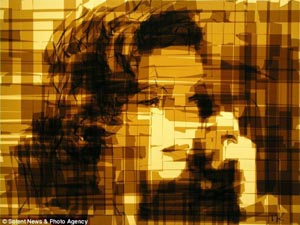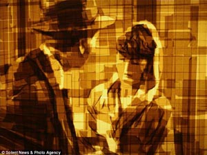 據(jù)《每日郵報(bào)》報(bào)道,一位烏克蘭藝術(shù)家發(fā)明了一種全新的藝術(shù)創(chuàng)作形式,他用封箱膠帶作畫(huà),在燈箱上“粘”出經(jīng)典的電影鏡頭。 今年51歲的馬克·凱斯曼出生在烏克蘭,目前在美國(guó)費(fèi)城工作和生活。他巧妙地利用了燈箱作為光源背景,用棕色透明膠帶在上面粘出一幅幅繪畫(huà)作品。凱斯曼把他最喜愛(ài)的電影鏡頭當(dāng)作作畫(huà)的素材,通過(guò)膠帶的重疊層次變化表現(xiàn)色彩明暗和深淺。 令人驚奇的是,這些膠帶畫(huà)雖然材料粗糙,卻異常精美,連人物的面孔和表情都惟妙惟肖。
