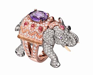ring)是一個永恒的工藝作品。這款珍貴的大象式戒指輕輕地附在手指上,毫不費力地托起Maharadja寶藏中一個中央寶石,附在鑲滿各式珠寶的粉金地毯上,這一構(gòu)思是從印度皇室御用的禮儀大象獲得靈感。作品得名源于印度語“大象”這個詞,在吉卜林(RudyardKipling)的小說森林王子(The