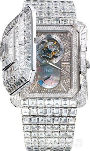 .35克拉祖母綠切割美鉆,奢華無比。輕觸第一枚鉆石按鈕,白色珍珠貝母表盤緩緩出現(xiàn)在眼前,設(shè)計(jì)簡約,光澤獨(dú)特迷人,時(shí)間刻度由方形切割美鉆鑲嵌而成,配備伯爵56P石英機(jī)芯。而按下第二枚鉆石按鈕后,即能欣賞浮動(dòng)陀飛輪機(jī)芯的美妙運(yùn)作。得益于在超薄機(jī)芯領(lǐng)域的深厚功力,雙層腕表一直是伯爵的拿手好戲,一枚鑲滿鉆石的雙神秘開關(guān)設(shè)計(jì)腕表不僅將伯爵善于結(jié)合頂級(jí)珠寶與制表工藝的特質(zhì)發(fā)揮得淋漓盡致,更讓這枚腕表成為一件獨(dú)一無二、美不勝收的藝術(shù)品,達(dá)到登峰造極的完美境界。