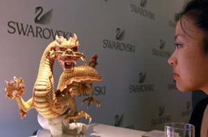 全球著名的仿水晶品牌施華洛世奇水晶軒旗艦店在上海和平飯店揭幕。一座用6萬多顆黃水晶鑲嵌的“金龍”擺件將以16.9萬元的起拍價(jià),在店中進(jìn)行為期一月的拍賣,拍賣所得將通過中華環(huán);饡,捐給“攜手保護(hù)生命之河—長江”項(xiàng)目,為改善長江沿岸特定地區(qū)的水源問題提供經(jīng)費(fèi)。