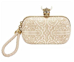 在這款手包中,標志性的骷髏頭上裝飾了斗士的牛角,霸氣十足,王者風范。在此時看來,更彰顯McQueen在時裝界無人能比的帝王氣度。 限量版Scrimshaw樹脂琉璃戰(zhàn)士骷髏頭手包,限量版Scrimshaw樹脂琉璃戰(zhàn)士骷髏頭手包。
