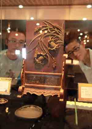 8月28日,為期9天的首屆文房四寶精品展在北京潘家園舊貨市場(chǎng)舉行,展出的200余件筆、墨、紙、硯和文房周邊用品中,既有收藏級(jí)別的歷代名品,也有當(dāng)前市面上流通的文房精品。 圖為參觀者在首屆文房四寶精品展上欣賞硯臺(tái)。新華社發(fā)