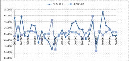2008年-2010年北京租賃市場(chǎng)租金價(jià)格同CPI環(huán)比漲幅趨勢(shì)對(duì)比