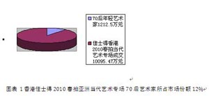 2010年70后藝術(shù)家所占的市場份額逐漸增大是一個最為顯著的現(xiàn)象。而這一點迥異于當(dāng)代藝術(shù)市場風(fēng)生水起的2007年。2010年春拍以香港蘇富比、香港佳士得、北京保利、北京匡時為例,尹朝陽5張、管勇3張、李松松3張、李暉3件、韋嘉3張,總共上拍17張,較2007年市場規(guī)模增長明顯。成交金額以2010年香港佳士得春拍為例,亞洲當(dāng)代藝術(shù)專場成交10095.47萬元。70后年輕藝術(shù)家在佳士得春拍中成交1212.5萬元是所占市場份額12%,
