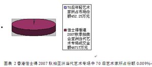 而以2007香港佳士得秋拍亞洲當(dāng)代藝術(shù)專場46,717余萬元成交(四億六千七百十七余萬元),如火如荼的當(dāng)代藝術(shù)市場崛起之時,而70后年輕藝術(shù)家總共成交4522500萬元,所占的份額比例了了。兩相比較,70后年輕藝術(shù)家市場份額的增長是絕對的,當(dāng)代藝術(shù)市場的總體縮水是相對的。