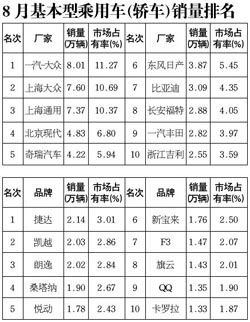 8月,銷量排名前十位的轎車品牌共銷售17.21萬輛,占轎車銷售總量的24.16%。與上月比較, 前十位轎車品牌銷量八增二降,新寶來增長最快,為22.422%;悅動(dòng)與凱越分別增長16.34%、13.41%;F3和卡羅拉分別微降0.68%、2.92%。