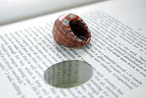 也許年少的時(shí)候你也折過紙戒指,不過今天看到的紙戒指,跟當(dāng)年你的那枚真是很不同。Jeremy May從書本中挖出一部分,用獨(dú)特的壓制方法把上百頁(yè)的紙張壓到一起,雕刻成形狀獨(dú)特的戒指,再細(xì)心打磨出光澤,最后的最后,把成品的戒指再放回書本切出的空間里。書頁(yè)上的文字會(huì)在戒指上若隱若現(xiàn),選一本有寓意的書本來制作這么一枚有心意的紙戒指,應(yīng)該很浪漫吧?