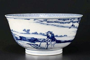 該碗碗口寬約20厘米,碗體上繪有正在耕地的農(nóng)夫和一頭水牛。