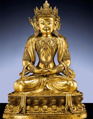 而今年的春拍,雖然書畫再次成為中國藝術拍賣市場交易的重中之重,但佛像類也表現(xiàn)積極。瀚海金銅佛像兩個專場總成交9200萬元,其中“十九世紀尼泊爾摩耶夫人造像”以1120萬成交。香港佳士得春拍,“明宣德御制鎏金銅無量壽佛坐像”以7010萬港元成交。