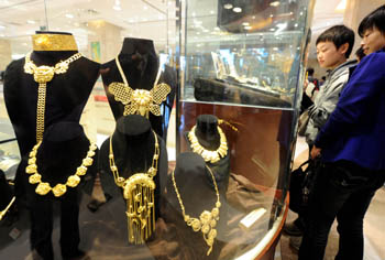 10月4日,顧客在北京菜百公司選購(gòu)黃金飾品。近期,黃金價(jià)格屢創(chuàng)新高,但北京菜市口百貨公司黃金珠寶首飾銷(xiāo)售依然火爆。據(jù)介紹,國(guó)慶節(jié)以來(lái),每天來(lái)菜百選購(gòu)黃金珠寶首飾的顧客數(shù)量比節(jié)前大約增加40%。新華社記者 羅曉光/攝 |