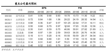 太平洋證券則重點(diǎn)推薦造紙業(yè)。報(bào)告稱,今年上半年造紙及紙制品行業(yè)24家A股上市公司共實(shí)現(xiàn)歸屬母公司凈利潤23.07億元,同比增加15.34%。金融危機(jī)后,隨著宏觀經(jīng)濟(jì)的整體向好,造紙行業(yè)下游恢復(fù),出現(xiàn)量?jī)r(jià)齊升的良好局面。而人民幣升值與節(jié)能減排的利好因素將為行業(yè)四季度的持續(xù)走強(qiáng)提供保障,預(yù)計(jì)2010年全年,造紙包裝行業(yè)與優(yōu)勢(shì)企業(yè)將實(shí)現(xiàn)業(yè)績(jī)的快速擴(kuò)張。