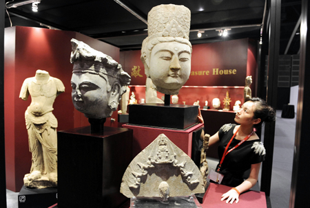 10月3至6日,亞洲最頂尖的古玩及藝術(shù)品博覽會——香港國際古玩及藝術(shù)品博覽(“FINEARTASIA2010”)在香港會展中心舉辦,呈獻(xiàn)約5000件跨越古今與東西方之藝術(shù)珍品,全場總值高達(dá)5億港元。圖為香港乾坤堂收藏的唐朝大理石雕塑《菩薩頭像》(上),價(jià)值達(dá)380萬港元。