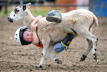 不過,大多數(shù)參賽者只堅持1秒就從羊背上摔下來。上屆總冠軍洛根·萊梅爾現(xiàn)年8歲,雖然他超齡不能參賽,但他樂意分享奪冠訣竅:“重心前移,直到掉下來都緊抓不放!4歲的賈克森·富爾頓已晉級今年州決賽,他的經(jīng)驗是抓緊羊毛,雙腿夾緊羊身。