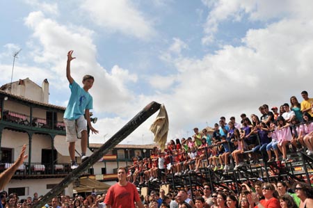 8月13日,西班牙馬德里自治區(qū)的欽瓊市為慶祝城市保護神節(jié)舉行“勇走滑木”比賽。欽瓊市中心的噴泉處臨時設立了一根斜放的木桿,上面涂抹油脂,以減少木桿的摩擦力,參加者光腳或穿襪子從木桿的一端向另一端前進,目標是取下位于木桿頂端的毛巾,優(yōu)勝者將獲得西班牙特色食品——生火腿作為獎勵。這一活動吸引了眾多勇敢者一試身手,但絕大部分參加者在半途就失足滑落水中,與獎品無緣。(記者 陳海通/攝)