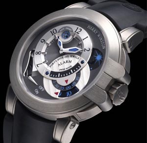 (星型轉(zhuǎn)盤)、晝夜指示、附有晝夜指示的鬧鈴性能,動力儲存 72小時,黑色橡膠表帶,防水 100米,限量系列 50 只 ,僅于Harry Winston