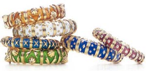 他運(yùn)用這一工藝,在紅、綠、藍(lán)、玫瑰和白色的點(diǎn)綴下制作手鐲,這款作品也是杰奎琳-肯尼迪的最愛。照片中的她經(jīng)常佩戴這款手鐲,以至于該作品被稱作“杰姬的手鐲(Jackie