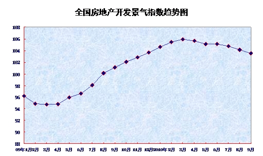 9月份,全國(guó)房地產(chǎn)開發(fā)景氣指數(shù)(簡(jiǎn)稱“國(guó)房景氣指數(shù)”)為103.52,比8月份回落0.59點(diǎn),比去年同期提高2.44點(diǎn)。
