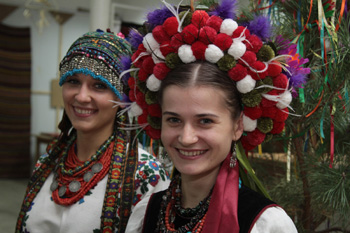 烏克蘭傳統(tǒng)婚禮服裝樣式很獨特,新娘的服裝一般只在緊身襯裙外罩一條羊毛短裙,襯裙上有各色圖案;上身著深紅色、綠色或藍色天鵝絨或羊毛料的無袖上衣。上衣前襟部分交疊,用扣子扣住;腳穿紅色長靴;頸上掛好幾串彩色珠子或項鏈。在頭上帶有花環(huán)和配有各色的彩帶。這種獨特的著裝為烏克蘭的婚禮增添了不少民俗氣息。