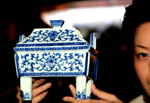 這是10月25日在上海世博園內(nèi)拍攝的一款《盛世中華青花瓷鼎》。