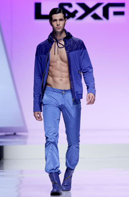 男裝品牌L&XF以“激情誘惑”“時(shí)空浪漫”兩個(gè)系列詮釋了“未來主義”的主題!凹で檎T惑”展示了大面積藍(lán)色與紅色的搭配;“時(shí)空浪漫”中,高貴神秘的紫色、輕盈活力的果綠色等一系列明亮的色彩被創(chuàng)意組合“以往男裝總是給人色彩暗淡、線條呆板的印象,要打破男裝設(shè)計(jì)的單一化,就得進(jìn)行大膽創(chuàng)新,比如藍(lán)色、紅色等明亮色彩就能夠搭配出視覺沖擊力,讓男人更加時(shí)髦而富有運(yùn)動(dòng)感!盠&XF設(shè)計(jì)師劉小飛向記者表達(dá)了這樣的觀點(diǎn)。