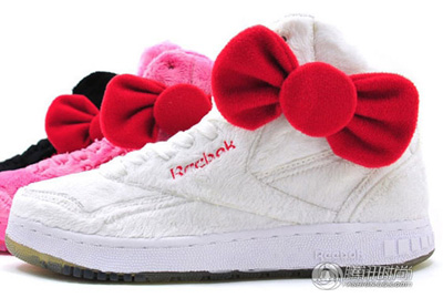 Kitty品牌盯上的是運動大廠Reebok,兩者合作了這款有大大的蝴蝶結(jié)標(biāo)志的運動鞋,有黑、白以及Hello