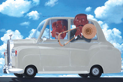 米斯尼亞迪的《伸縮喇叭》即體現(xiàn)了這種“諷刺與幽默”。這件作品描繪一個衣冠楚楚的人探身窗外,在豪華的勞斯萊斯車上高興吹著長號,看似風(fēng)光無限。然而細看畫面配文,一位女士正在訓(xùn)斥他:“Bisakah