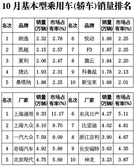 10月銷量排名前十位的轎車品牌與上月相比,朗逸、夏利、F3和科魯茲呈不同程度增長(zhǎng),其它品牌有所下降。上述十個(gè)品牌共銷售19.39萬輛,占轎車銷售總量的23.22%。