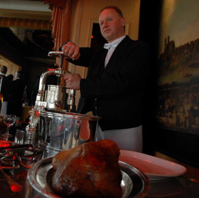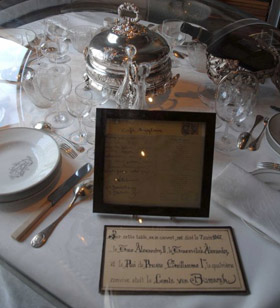 銀樓餐廳總經(jīng)理安德烈·泰拉伊在大廳迎接記者。他首先介紹了窗邊一張?zhí)厥獠妥,上面擺放著特供王室的銀質(zhì)刀叉、器皿和水晶杯等。1867年巴黎世博會(huì)期間,俄國(guó)沙皇亞歷山大二世、普魯士國(guó)王威廉一世和首相俾斯麥三人曾在這張餐桌上大啖血鴨,餐桌及他們使用的餐具從此被銀樓餐廳永久保存。