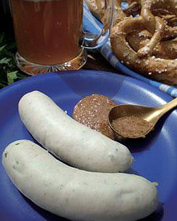 德國(guó)人早餐喜歡吃白香腸(Weisswurst),是巴伐利亞的一道傳統(tǒng)菜,吃時(shí)去皮,搭配芥末醬和面包吃。也有在Wurst之前加地名的,很明顯,那就是當(dāng)?shù)氐奶禺a(chǎn),且以烤制香腸為主,比方說(shuō)紐倫堡香腸(Nurnberger