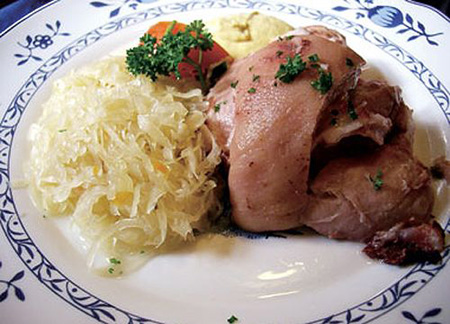 德國(guó)人愛(ài)吃豬肉,據(jù)說(shuō)每人每年平均吃掉66公斤豬肉。所以,在菜單上最常見(jiàn)到也是跟豬有關(guān)的菜。比較有當(dāng)?shù)靥厣挠蠩isbein,就是豬蹄,也有稱豬腳和豬手。Eisbein一般指的是煮,也有做法是烤,稱作Schweinshaxe,皮脆而不干,配酸菜,酸白菜的德文是Sauerkraut。從價(jià)格上來(lái)講,也是豬肉相對(duì)便宜,其次是牛肉,然后是魚(yú)。但是魚(yú)的話,建議不點(diǎn),總之不是特別好吃就是了。