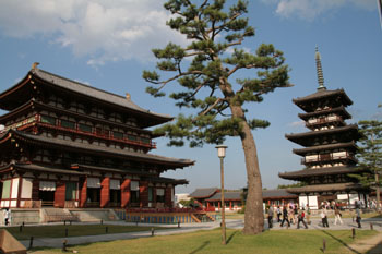 藥師寺的東塔聳立了1300年,西塔是1981年復(fù)建的。一座飽經(jīng)風(fēng)霜,一座金碧輝煌,相映成趣。東塔實(shí)為三層,但是每層下面都有收縮的夾層,看起來是六層,富有節(jié)奏感,被譽(yù)為日本最美的塔。藥師寺金堂也是這種帶有夾層的結(jié)構(gòu),所以顯得格外優(yōu)美。從藥師寺西部稱為“大池”的湖泊遠(yuǎn)眺,東塔和西塔高聳的一舊一新的塔剎,富有動(dòng)感的塔身,金堂寬大雄偉的屋頂,金色的鴟尾——這富有動(dòng)感的三座建筑組合在一起,巧奪天工,被稱為“凝固的樂章”,是很多攝影發(fā)燒友的最愛。